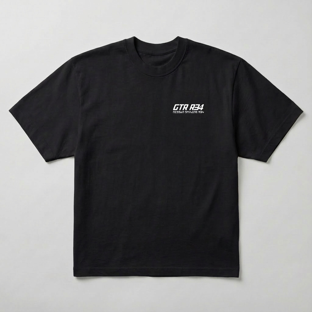 T-shirt z konkretną, techniczną grafiką srebrnego Nissana Skyline GT-R R34 „Bullet” na plecach. Możesz wybrać krój klasyczny lub oversize – oba leżą dobrze i są wygodnie.